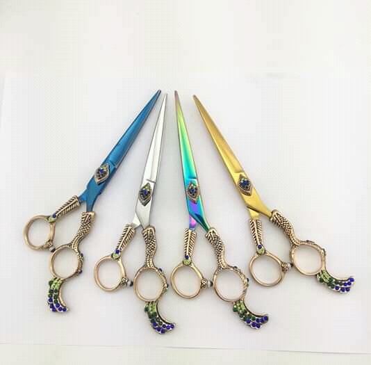 hese premium scissors feature intricately designed dragon-shaped handles, offering a blend of functionality and artistic craftsmanship. Besides their aesthetic appeal, they provide excellent grip and balance, making them ideal for precision cutting in professional hairstyling.
