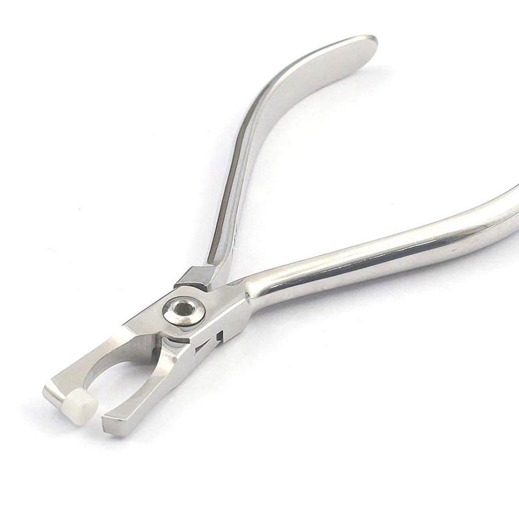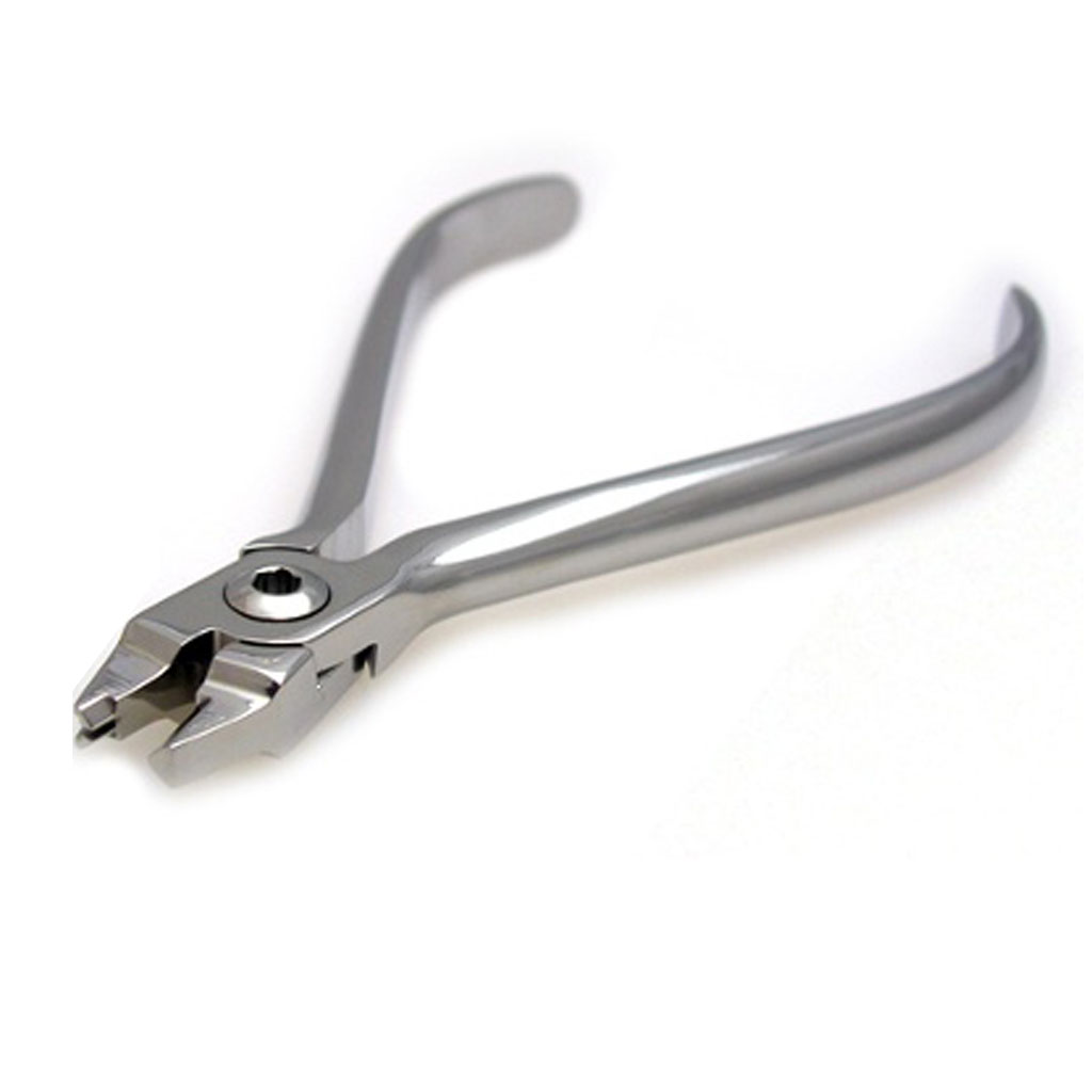 This orthodontic tool is used for bending and shaping wires in braces. Its unique beak-like design, with tapered and rounded tips, allows for precise control and manipulation of wires, making it essential for adjusting and customizing braces.