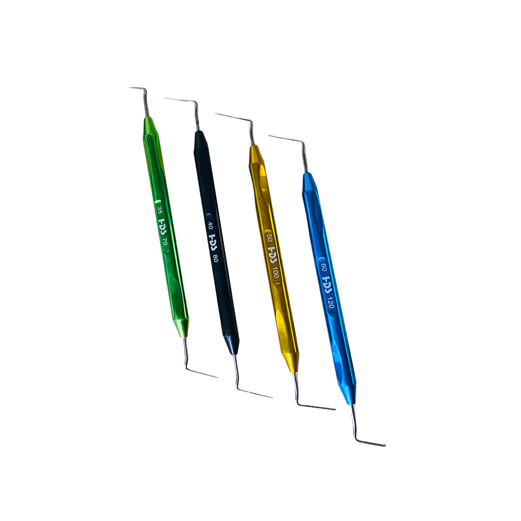 This set includes various tools for applying and shaping plastic dental fillings. The "anti-lengket" (non-stick) feature ensures that the instruments do not adhere to the filling material, allowing for smooth application and precise adjustments.