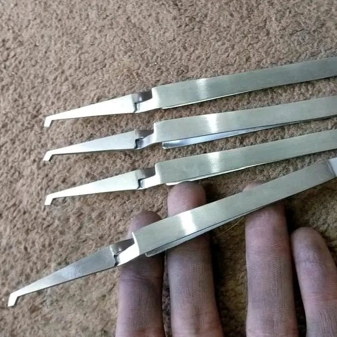 These precision tweezers are used in orthodontics to hold and place brackets on teeth during the application of braces. Their fine, angled tips ensure accurate positioning and a secure grip on the brackets, facilitating proper alignment.